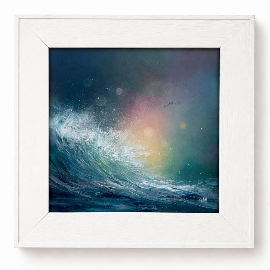 A framed 12x12 inch canvas, total size is 16x16 inch in size. A stunning ethereal textured sea wave with a little bird flying overhead in oil mixed media. A powerful little painting to help you remember that when stuck in a negative situation in life, you hold the power to change it…..to move forwards towards brighter things. Free UK delivery by Royal Mail tracked or Parcelforce. For orders outside UK please contact me before purchase. * please note colours may vary slightly from what you see on screen’ please allow 1-7 days for delivery *